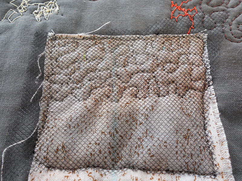 This shows the difference between a sewn down section on the left and the non sewn part on the right. As with the previous layer, I used smoke monofilament thread and a small stippling stitch.